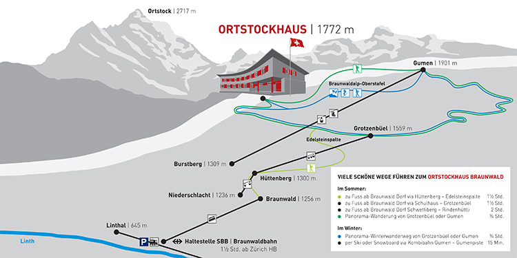Das Ortstockhaus liegt an der Panoramawanderung Braunwald zwischen Gumen und Grotzenbüel. Zudem ist das Ortstockhaus Etappenziel der Glaralpina – dem Glarner Weitwanderweg. Mit dem Mountain- oder E-Bike ist das Ortstockhaus gut über Alpsträsschen erreichbar. Der Gumen Enduro Trail führt direkt am Haus vorbei.